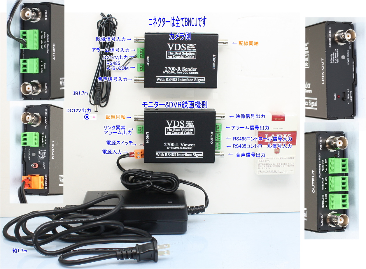 【特長】 カメラとモニター間の同軸ケーブルが 1本(電源/映像/音声/P/Tカメラ制御(RS-485)/アラーム信号)で 配線可能です(工事の簡略化) カメラとモニターやVTR,テレビなどとの接続に 配線ケーブル1本で映像/音声/電源を重条接続可能にした商品です。 (映像/音声/電源/制御(RS-485)/アラーム)を混合し1本同軸線で送り 、又映像/音声/電源を取り出します) ビデオ信号(NTSC/PAL),オーディオ信号、DC12V(電源供給Max:1Aまでのカメラ)、 制御信号(RS-485)、アラーム信号)を同軸 ケーブル1本で最長600mまで伝送が可能です。 映像・音声・制御の信号を 最大1200m(カメラにDC12Vを供給する場合は600m)まで延長可能。 *注意:消費電流1Aを超えるカメラの場合はカメラへ直接カメラ専用電源を接続下さい ●VDS2700-R(カメラ側)は CCDカメラ等にDC12V(電源供給Max:1Aまでのカメラ)と 制御信号(RS-485)を供給し、 ビデオ、オーディオ信号、アラーム信号を受け取り、 同軸ケーブル1本にて送信します。 ●VDS2700-L(モニター側)はDC40Vの電力供給 を受けAV機器(監視装置、VTR,TV等)に ビデオ、オーディオ信号、アラーム信号を出力します。 ●VDS2700-L、VDS2700-R間のリンク接続切断等の異常警告出力機能。 ●ビデオ、オーディオ信号の入出力コネクターはBNCJです (BNCP-RCAJ変換コネクタは(46069)別売) ●カメラの電源プラグは通常の2.1Фmm使用可 ●サイズ:100(W)×75(H)×26.75(D)mm(箱部) ●重量 210g 【本機を使用する事により】 ●CCDカメラを設置する場合、設置場所に電源(工事)を設ける必要がありません ●途中の配線がカメラ1台に対して一本の同軸ケーブルのみの為、配線工事が 容易になります。 ●工事費用の削減、システムの簡略化が図れます。 ●DC12V電源が供給できるので、安価なDC12V(センター+)駆動のカメラをご使用になれます。 |