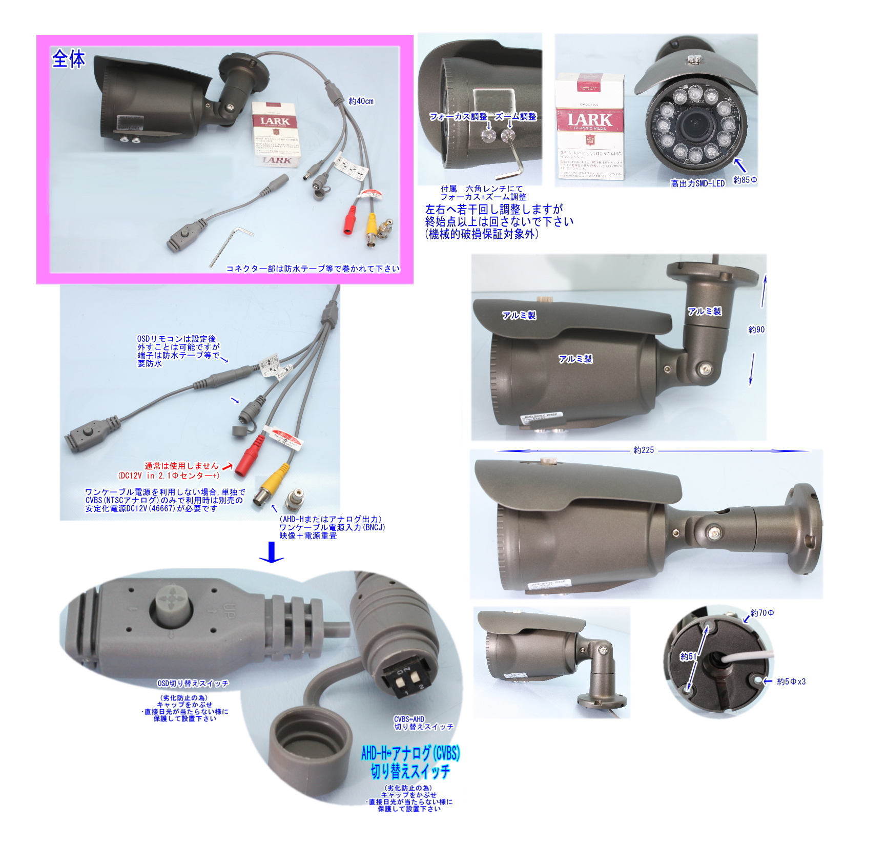 屋外仕様(屋内も設置可能) (防雨仕様/IP66) 明かり無しでもOK! 220万画素,1200TVL,高性能機 従来のアナログ(CVBS)映像信号と 最新のAHD-H(1080p)信号を切り替え出力