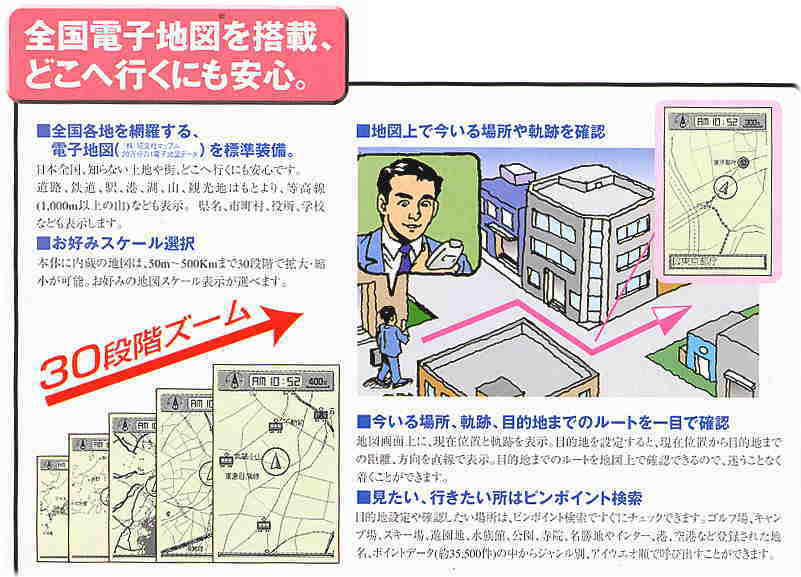 | --位置情報-- ●現在位置の確認(地図および数値)。 緯度・経度・高度・時刻を表示。 ●移動中の走行スピードと方位を表示。 ●最大500ヶ所のウェイポイントを登録、データ保存。 --ナビゲ−ション-- ●目的地までのルートをナビゲーション(地図および数値)。 方位、距離、進行方向、速度、所要時間などを表示。 ●移動地図表示(120m〜1.200kmまで拡大・縮小が可能 /自動ズーム選択機能付) ●1ルート/50ポイント登録可能(1ルートのみ) ●来た道を保存してナビゲーションするトラックナピ機能 ●見やすい大型コンパスと現在位置アイコン表示で −目で位置確認が可能。 --軌跡-- ●通過した道を軌跡として保存が可能(100トラック) ●日の出/日の入り時刻を現地時間で表示. --その他-- ●機能がシュミレーションで見れるデモ機能。 ●ELパックライト付。 ●デイファレンシャル対応。 |