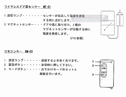 コントロールパネルおよび各センサーはすべて無線式になっていますので、配線不要で取り付けが非常に簡単です. 暗証番号またはリモコンキーのボタンを押すことによって警備をセット/解除しますので、お子様からお年寄りまで簡単にご使用いただけます. ゾーン1〜4まで各センサーを分類.して設定できますので、どのセンサーが反応したかコントロ「ルパネルで確認することができます. コントロールパネルとリモコンキーには緊急ボタンがついています.・緊急ボタンは警備の状態(セット/解除)・に関係なく、押せば直ちに警報状態になります. すべての機器において、他人にカバーをこじ開けられたり電池を抜こうとされた場合、タンバー回路によって警備解除の状態でも警報します. (電池交換の際は暗証番号の入力により、タンバー回路をOFFに設定できます) コントロールパネルには100dBのサイレンが内蔵されています. システムを警備状態セットにしてから、自分が退室するまでの時間を10〜99秒の間で設定できます. 帰宅したとき、玄関に入ってから警備状態を解除するまでの時間を10〜99秒の間で設定でき、この間は発報しません. この時間内に警報を解除しないと警報します) 各機器すべてにセキュリティーコードが512通りあるので他人が同じ機器を使用して警備状態を解除しようとしてもセキュリティーコードが知られなければ解除できません 個別にセキュリティーコードを設定することにより隣接の住宅のワイヤレス機器との混信を防ぐことができます。 ・停電あるいは故意に電源を落とされた際に警備を継続するバックアップ電源機能がついています.(単3ニツカド電池8本別売) おでかけモードとおやすみモードの設定により外出時はすべてのセンサ ーを警備状態(ARM)にして、在宅時(PARM)は外部からの進入を警戒するセンサーだけを警備状態にすることができます. ・警報サイレンを鳴らす時間は1〜20分の間で設定できます. ・センサーが反応すると、警備を解除するまでの間コントロールパネル上で反応したゾーンのLEDが点灯し、不在時の異変をお知らせします. |