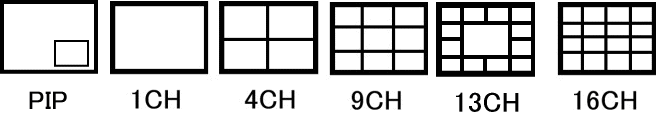 ・複数のチャンネルの分割方法が可能です (下記はライブ表示時可能な分割画面です、再生時はPIPと13CH表示のみは出来ません。 再生時は1、4、9、16分割表示再生は可能です)) ![]()
