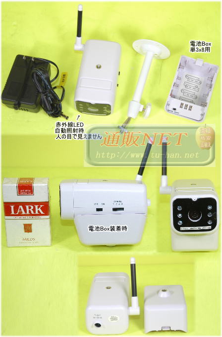 (ワイヤレスカメラ送信機) *2400Mhz帯, *4チャンネル切り替え式(1〜4ch) *1/3" 総画素数27万画素/有効画素数25万画素CMOSピンホールカラーカメラ内蔵 *集音マイク内蔵 *最低照度: 3LUX *レンズ:f=5.6mm,F2.0 *画角:水平約40度,垂直約33度 *LR44ボタン電池x5(約40分)(電池別売) /006P,9V電池(約6時間)兼用,約80mA *使用温度範囲: -10〜+50度 *重量約40g、全長約145mm *到達距離見通し約90m前後 *人相認識距離・・・約4〜5m *別売DC9V電池Box(47247) (受信部) *高感度指向性偏角アンテナ *4チャンネル切換式 *映像出力端子:RCAJ *77x70x22mm,85g *DC7.5V,約180mA *重量約180g (電池Boxのみ(49108) |