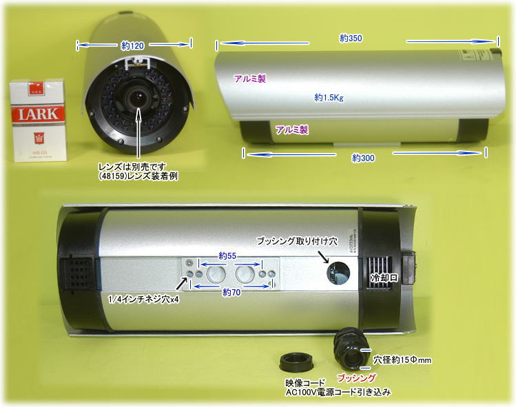 *消費電力,消費電流が大きい為 カメラ横へDC電源で3C2V相当線で100m,5C2Vで200m, または弊社の極太2本一体ケーブルを推奨 *注意:DC12V電源器は カメラ横に市販防水Box(ウオールBox)内へ収納し設置下さい *丈夫で錆びに強い全アルミダイカスト製ボディと高画質高機能で昼間はもちろん 極めて暗い環境下でも動画を映し出す本格的なプロ仕様のカメラです |