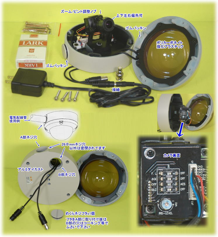 屋外軒下防雨仕様(IP66) (もちろん屋内でも使用可能) ●0.25LUX(かなり薄暗い場所でもOK) 画角が可変可能ですので設置時に便利です (内部切換スイッチで設定可能) ●AES機能内蔵: 手動のアイリスレンズを使うことに対して使用。 ●BLC:逆光補正機能内蔵 部屋から外に向かった場合の逆光で 被写体が見えずらい場合、見えやすくします ●AGC(自動ゲイン調整機能): 被写体環境の明暗を自動調整します ●FL(フリッカーレス機能内蔵): 50Hz地区での蛍光灯のちらつきを軽減します FL-on時はシャッタスピードが 1/100secに固定されます (その際は、内部スイッチAESをoffにします) ●DCレベル調整機能付き DCオートアイリスレンズ制御の感度を調整します |