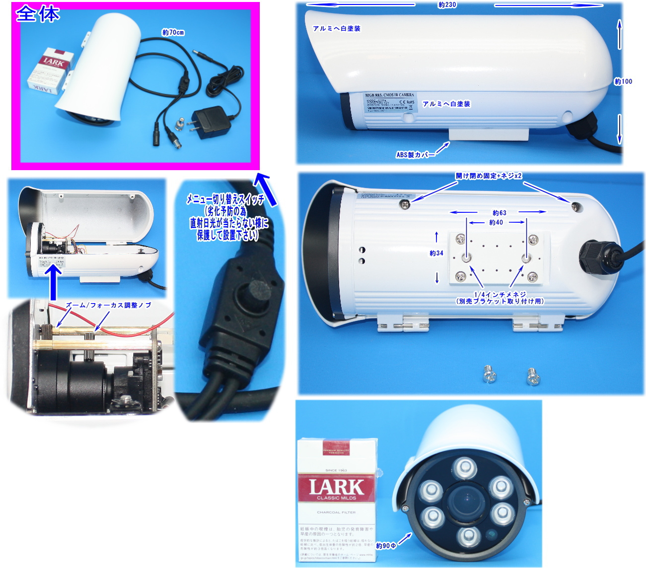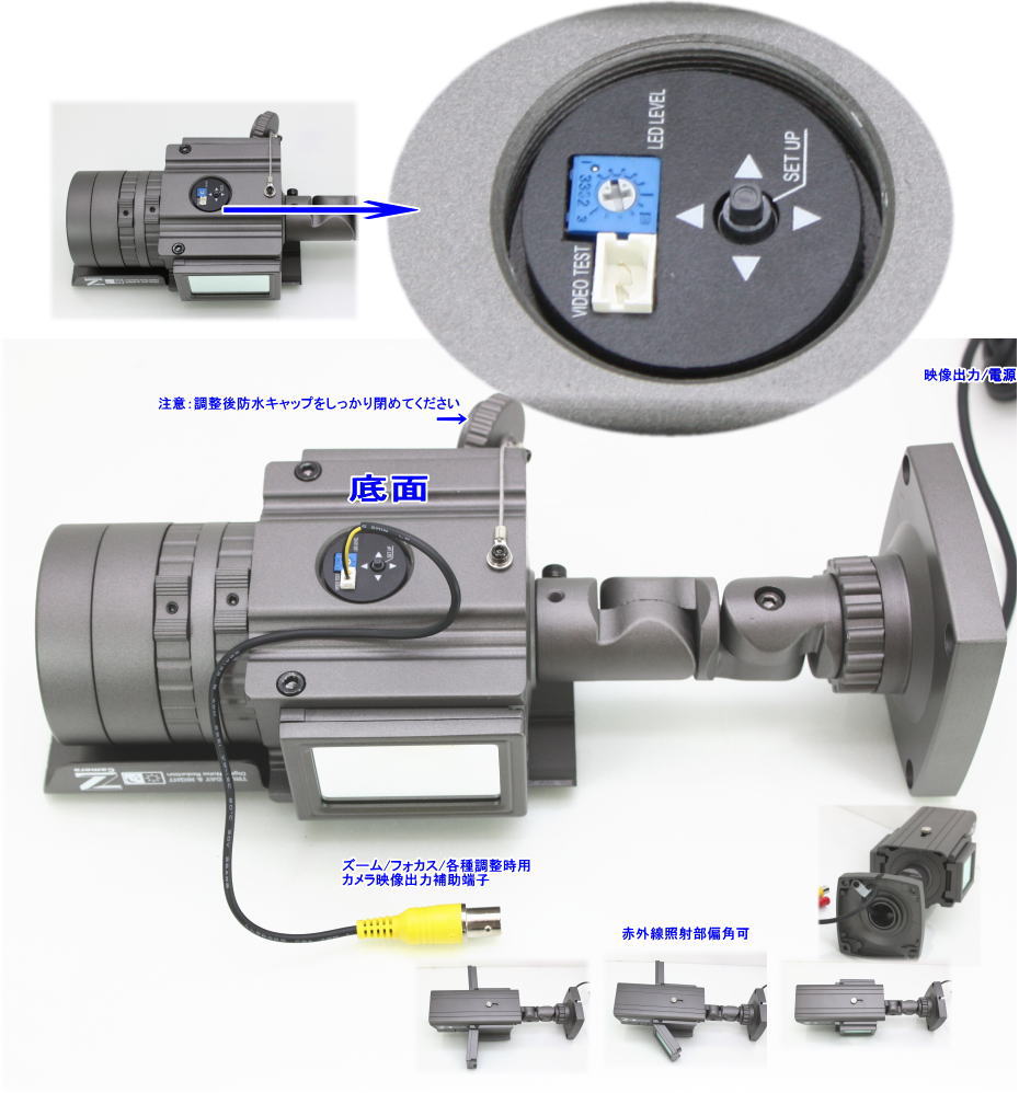 ![]() 赤外線照射距離Max:約50m〜70m 取り付けた状態でズーム/フォーカス調整可 カメラ底内部に別の映像出力付です