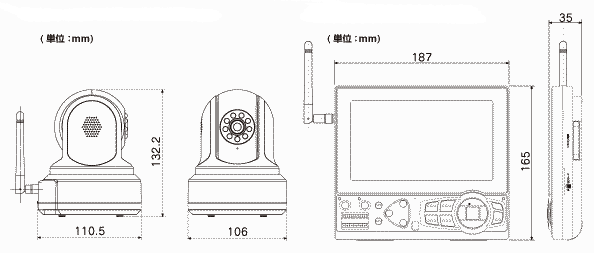 【屋内仕様ワイヤレスカラーカメラ仕様】 *映像素子:1/4インチカラーCMOS *画素数:総画素数27万画素/有効画素数25万画素 *レンズ:f=6.5mm(水平約31度/垂直約23度) *自動赤外線照射距離:Max約5m *旋回角度:水平約180度/垂直約60度(30+30) *周波数帯: 2.4GHz帯 *チャンネル数: 3チャンネル(弊社の他の受信機とは適合しません) *到達距離:見通し約30〜40m *使用温度範囲:0℃〜40℃ *電源:付属ACアダプターDC9V/1.5A *消費電力:約13W *重量: 280g (本体のみ) *寸法 104(幅)124(高)126(奥行)m 【受信機仕様】 *周波数帯: 2.4GHz帯 *チャンネル数: 3チャンネル *2.5インチカラー液晶モニター(TFT) *オートチャンネルセレクタ一機能内蔵 *8秒で各画像切替可 *アンテナ端子:SMA型脱着式で外部アンテナ使用可 *アンテナ: ダイボールアンテナ *画像音声:2.5Фステレオプラグ→RCAPx2 *重量: 170g (本体のみ) *寸法 68(幅)148(高)26(奥行)m *電源:DC9V/1.5A,ACアダプター付き(1.3Ф) (単4x4本電池Box内蔵) *消費電流: AC100V/13W |